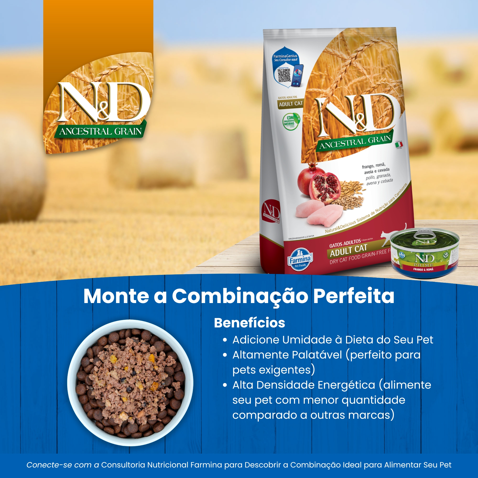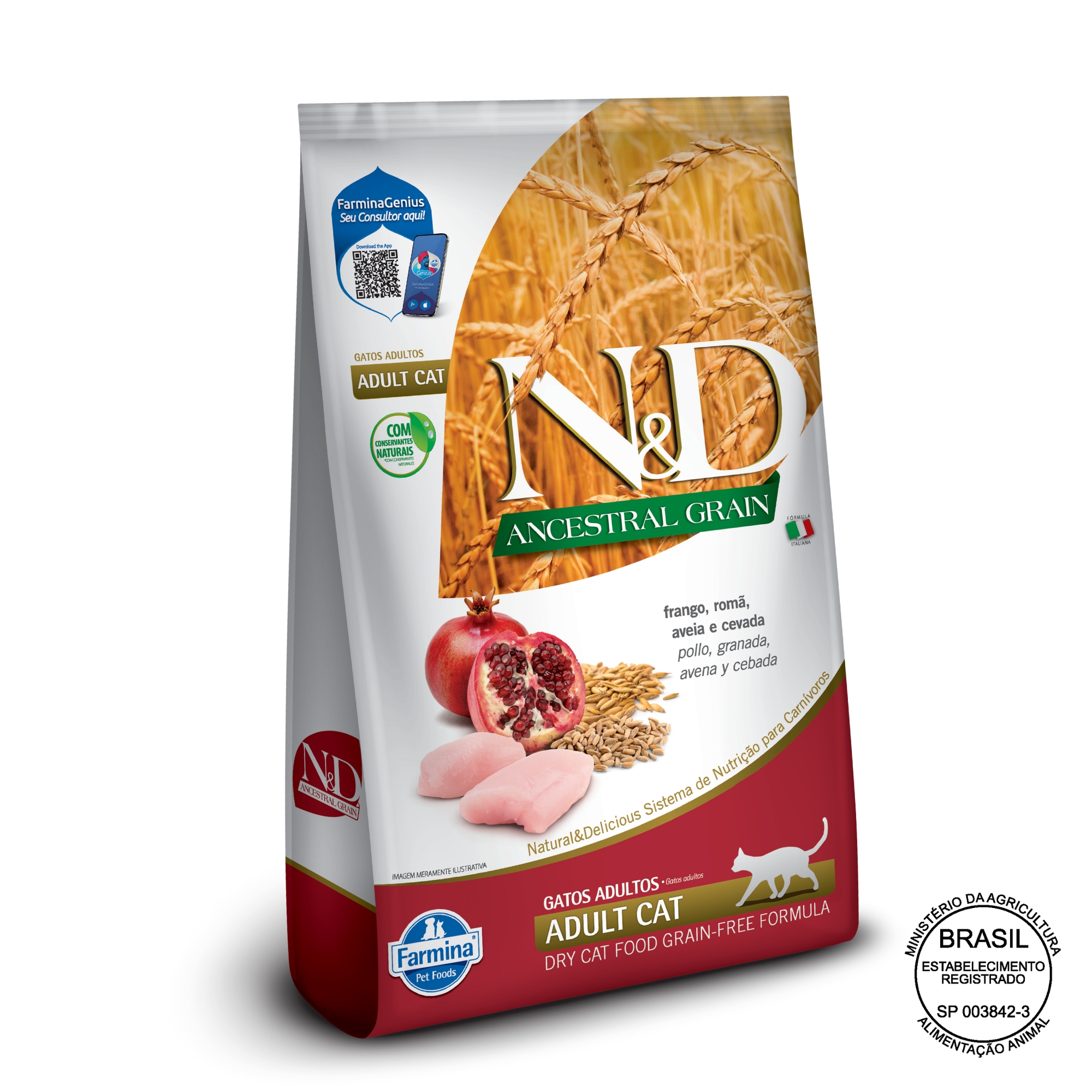 N&D Ancestral para Gatos Adultos de Todas as Raças Sabor Frango, Romã, Aveia e Cevada 7,5Kg