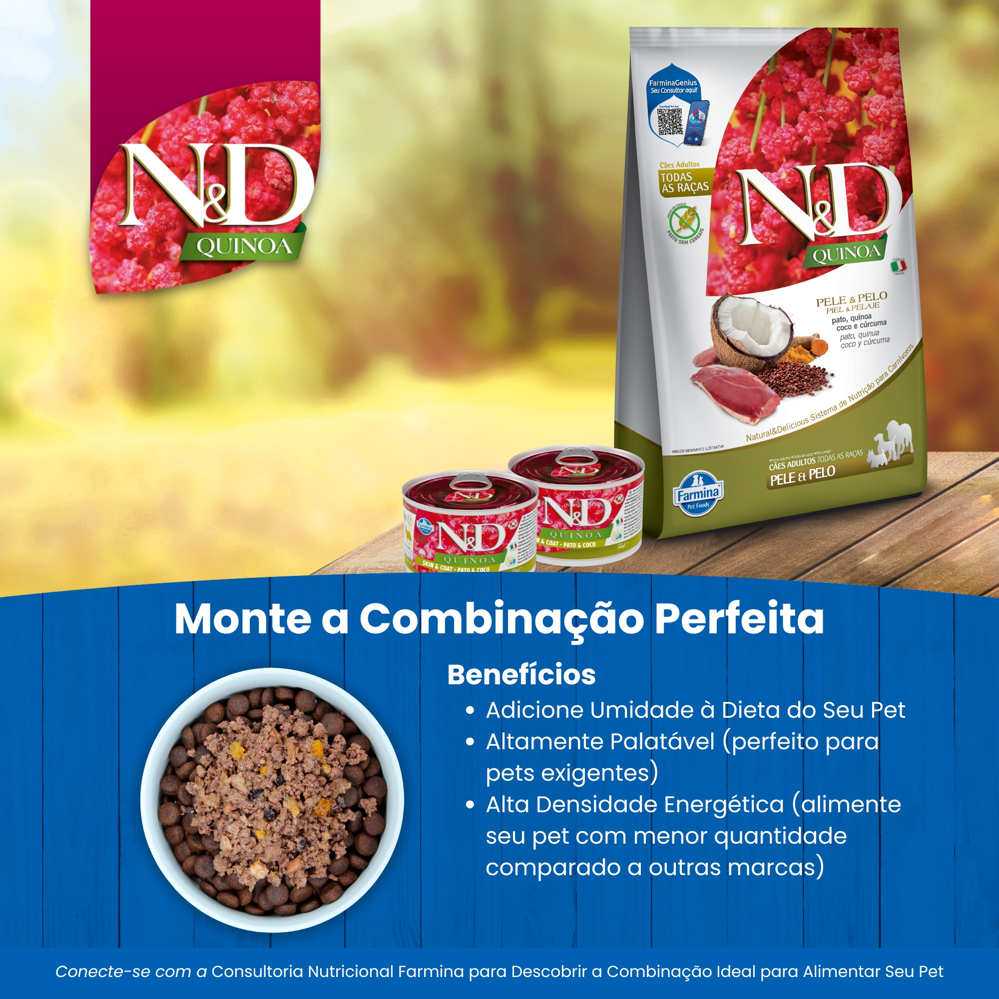 COMPOSIÇÃO BÁSICA: carne de pato (mín. 55%), grão de quinoa (mín. 5%), óleo de peixe, polpa de coco desidratada (mín. 2%), aditivo prebiótico (FOS), cloreto de colina, carbonato de cálcio, cloreto de potássio, sulfato de condroitina, hidrocloreto de glicosamina, vitaminas (A, D3, E), quelato zinco-metionina hidroxi analoga, quelato manganês-metionina hidroxi analoga, ferro aminoacido quelato, quelato cobre-metionina hidroxi analoga, levedura enriquecida com selênio, DL-metionina, taurina, L-Carnitina.