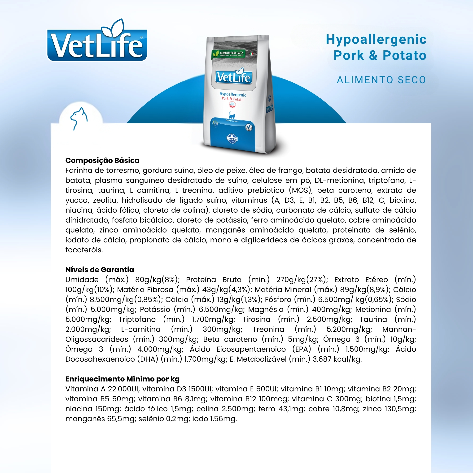 COMPOSIÇÃO BÁSICA: farinha de torresmo, gordura suína, óleo de peixe, óleo de frango, batata desidratada, amido de batata, plasma sanguíneo desidratado de suíno, celulose em pó, DL-metionina, triptofano, L-tirosina, taurina, L-carnitina, L-treonina, aditivo prebiotico (MOS), beta caroteno, extrato de yucca, zeolita, hidrolisado de fígado suíno, vitaminas (A, D3, E, B1, B2, B5, B6, B12, C, biotina, niacina, ácido fólico, cloreto de colina), cloreto de sódio, carbonato de cálcio, sulfato de cálcio dihidratado, fosfato bicálcico, cloreto de potássio, ferro aminoácido quelato, cobre aminoácido quelato, zinco aminoácido quelato, manganês aminoácido quelato, proteinato de selênio, iodato de cálcio, propionato de cálcio, mono e diglicerídeos de ácidos graxos, concentrado de tocoferóis.