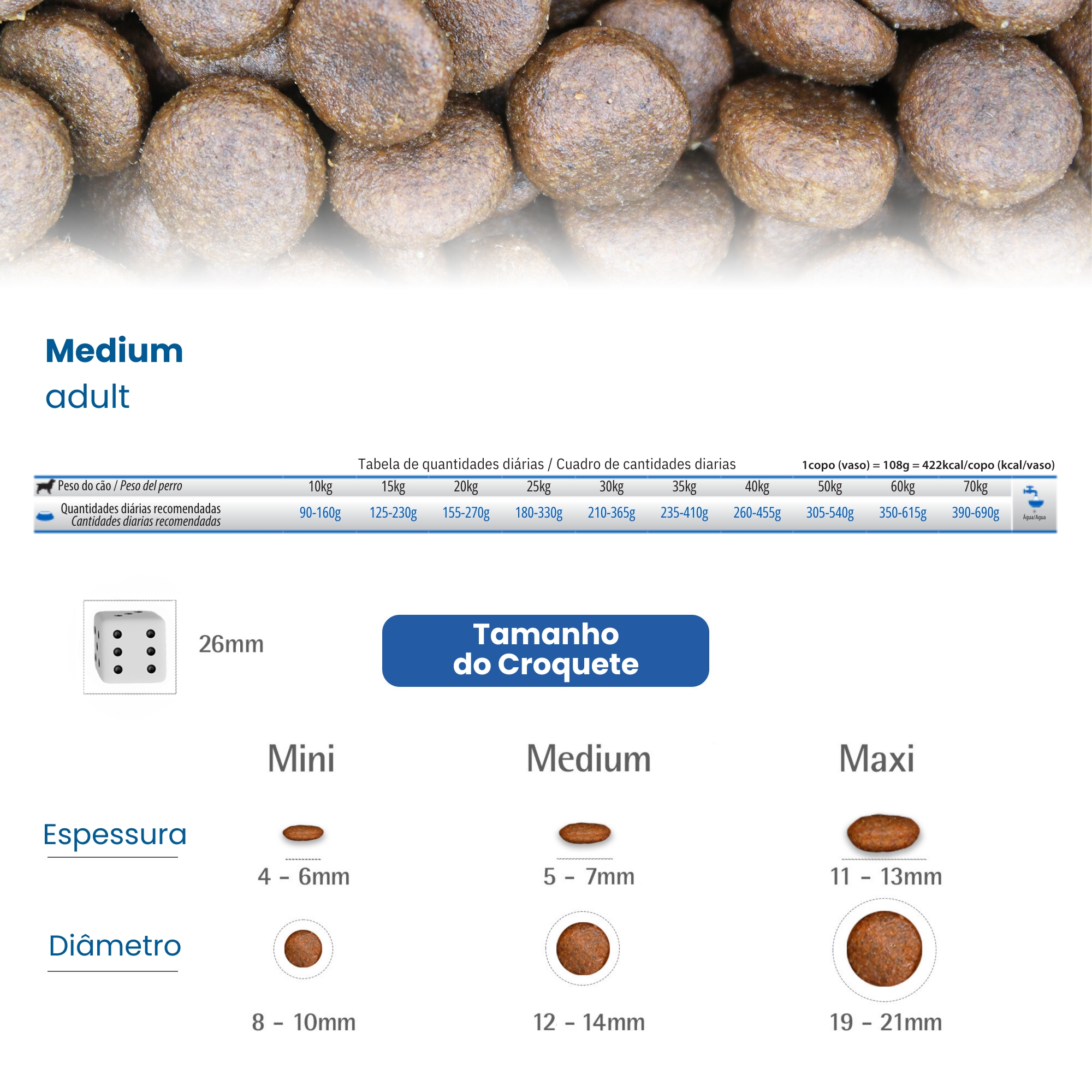 COMPOSIÇÃO BÁSICA: carne de ovino (cordeiro), farinha de carne e ossos de ovino (mín. 3%), farinha de vísceras de aves, ovo em pó, farinha de peixe, farinha de torresmo, amido de batata, amido de mandioca, óleo de peixe, óleo de frango, polpa de beterraba, casca de ervilha, alfafa desidratada, lignocelulose, semente de psyllium, levedura seca de cervejaria, cenoura desidratada, espinafre desidratado, laranja desidratada, maçã desidratada, extrato de mirtilo (blueberry) (mín. 0,075%), extrato de romã, extrato de chá verde, extrato de aloe vera, cúrcuma em pó, beta caroteno, aditivos prebióticos (FOS e MOS), DL-metionina, taurina, L-carnitina, sulfato de condroitina, sulfato de glicosamina, aditivos adsorventes (extrato de yucca e zeolita), hidrolisado de fígado de aves e suínos, vitaminas (retinol (A), colecalciferol (D3), acetato de DL-alfa-tocoferol (E), tiamina (B1), riboflavina (B2), cloridrato de piridoxina (B6), cianocobalamina (B12), ácido ascórbico monofosfato (C), biotina, niacina, ácido pantotênico, ácido fólico, cloreto de colina), cloreto de potássio, ferro aminoácido quelato, cobre aminoácido quelato, zinco aminoácido quelato, manganês aminoácido quelato, proteinato de selênio, iodato de cálcio, propionato de cálcio, concentrado de tocoferóis. Eventuais substitutivos: proteína hidrolisada de peixe, proteína hidrolisada de frango.