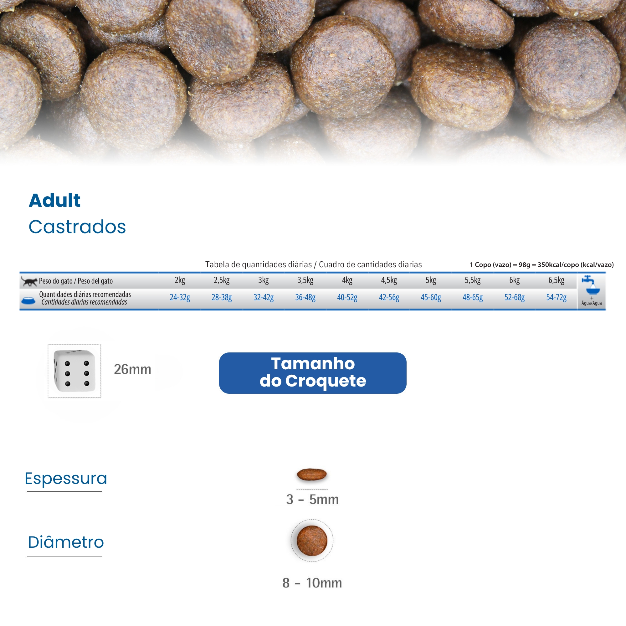 COMPOSIÇÃO BÁSICA: carne de frango (mecanicamente separada), farinha de vísceras de aves (mín. 10%), ovo em pó, farinha de peixe, farinha de torresmo, amido de batata, amido de mandioca, óleo de frango, óleo de peixe, polpa de beterraba, casca de ervilha, alfafa desidratada, lignocelulose, semente de psyllium, levedura seca de cervejaria, cenoura desidratada, espinafre desidratado, laranja desidratada, maçã desidratada, extrato de mirtilo (blueberry), extrato de romã (mín.0,08%), extrato de chá verde, extrato de aloe vera, cúrcuma em pó, beta caroteno, aditivos prebióticos (FOS e MOS), DL-metionina, taurina, L-carnitina, sulfato de condroitina, sulfato de glicosamina, aditivos adsorventes (extrato de yucca e zeolita), hidrolisado de fígado de aves e suínos, vitaminas (retinol (A), colecalciferol (D3), acetato de DL-alfa-tocoferol (E), tiamina (B1), riboflavina (B2), cloridrato de piridoxina (B6), cianocobalamina (B12), ácido ascórbico monofosfato (C), biotina, niacina, ácido pantotênico, ácido fólico, cloreto de colina), fosfato bicálcico, ácido fosfórico, cloreto de potássio, ferro aminoácido quelato, cobre aminoácido quelato, zinco aminoácido quelato, manganês aminoácido quelato, proteinato de selênio, iodato de cálcio, propionato de cálcio, concentrado de tocoferóis.Eventuais substitutivos: proteína hidrolisada de peixe, proteína hidrolisada de frango