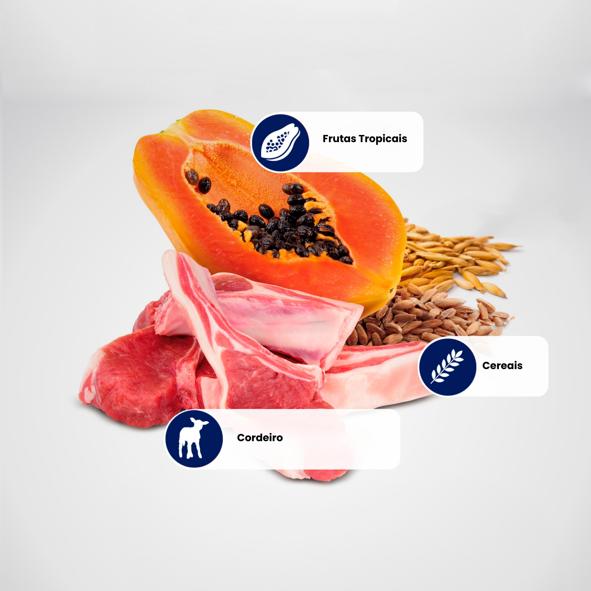 COMPOSIÇÃO BÁSICA: Cordeiro (carne de ovino, farinha de carne e osso de ovino – mín. 3,5%), cereais e frutas (aveia, grãos de sorgo, cevada em grãos, banana desidratada, mamão desidratado, kiwi desidratado, manga desidratada – mín. 35%), farinha de vísceras de aves, farinha de torresmo, ovo em pó, quirera de arroz, farelo de trigo, farinha de peixe, óleo de frango, óleo de peixe, polpa de beterraba, levedura seca de cervejaria, cenoura desidratada, aditivos prebióticos (FOS e MOS), DL-metionina, taurina, L-carnitina, sulfato de condroitina, sulfato de glicosamina, aditivos adsorventes (extrato de yucca e zeolita), hidrolisado de fígado de aves e suínos, vitaminas (A, D3, E, B1, B2, B5, B6, B12, C, biotina, niacina, ácido fólico, cloreto de colina), cloreto de sódio, cloreto de potássio, ferro aminoácido quelato, cobre aminoácido quelato, zinco aminoácido quelato, manganês aminoácido quelato, proteinato de selênio, iodato de cálcio, propionato de cálcio, concentrado de tocoferóis. Eventuais substitutivos: proteína hidrolisada de peixe, proteína hidrolisada de frango.