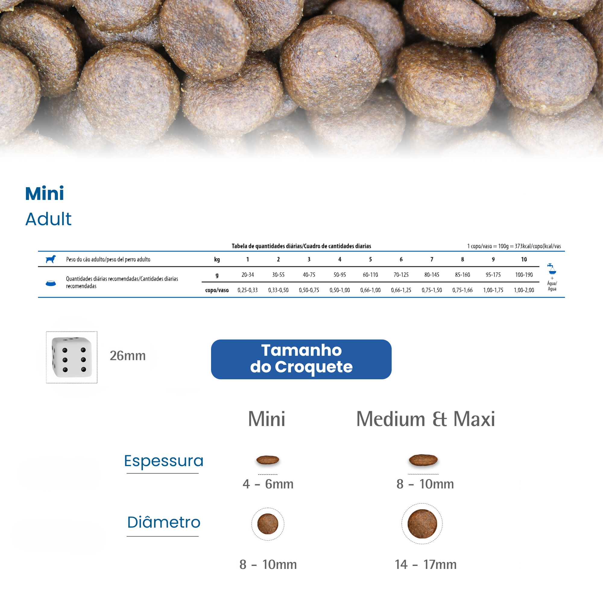 Umidade (máx.) 90g/kg(9%); Proteína Bruta (mín.) 260g/kg(26%); Extrato Etéreo (mín.) 140g/kg(14%); Matéria Fibrosa (máx.) 35g/kg(3,5%); Matéria Mineral (máx.) 75g/kg(7,5%); Cálcio (mín.) 8.000mg/kg(0,8%); Cálcio (máx.) 15g/kg(1,5%); Fósforo (mín.) 8.000mg/kg (0,8%); Sódio (mín.) 2.000mg/kg; Potássio (mín.) 5.000mg/kg; Magnésio (mín.) 900mg/kg; Ômega 6 (mín.) 25g/kg; Ômega 3 (mín.) 2.000mg/kg; DHA (mín.) 200mg/kg; EPA (mín.) 200mg/kg; Fruto-Oligossacarídeos (mín.) 300mg/kg; Mannan-Oligossacarídeos (mín.) 240mg/kg; Metionina (mín.) 5.000mg/kg; Taurina (mín.) 1.000mg/kg; L-Carnitina (mín.) 50mg/kg; Lisina (mín.) 11g/kg; Sulfato de Condroitina (mín.) 75mg/kg; Sulfato de Glicosamina (mín.) 150mg/kg; E. Metabolizável (mín.) 3.730kcal/kg