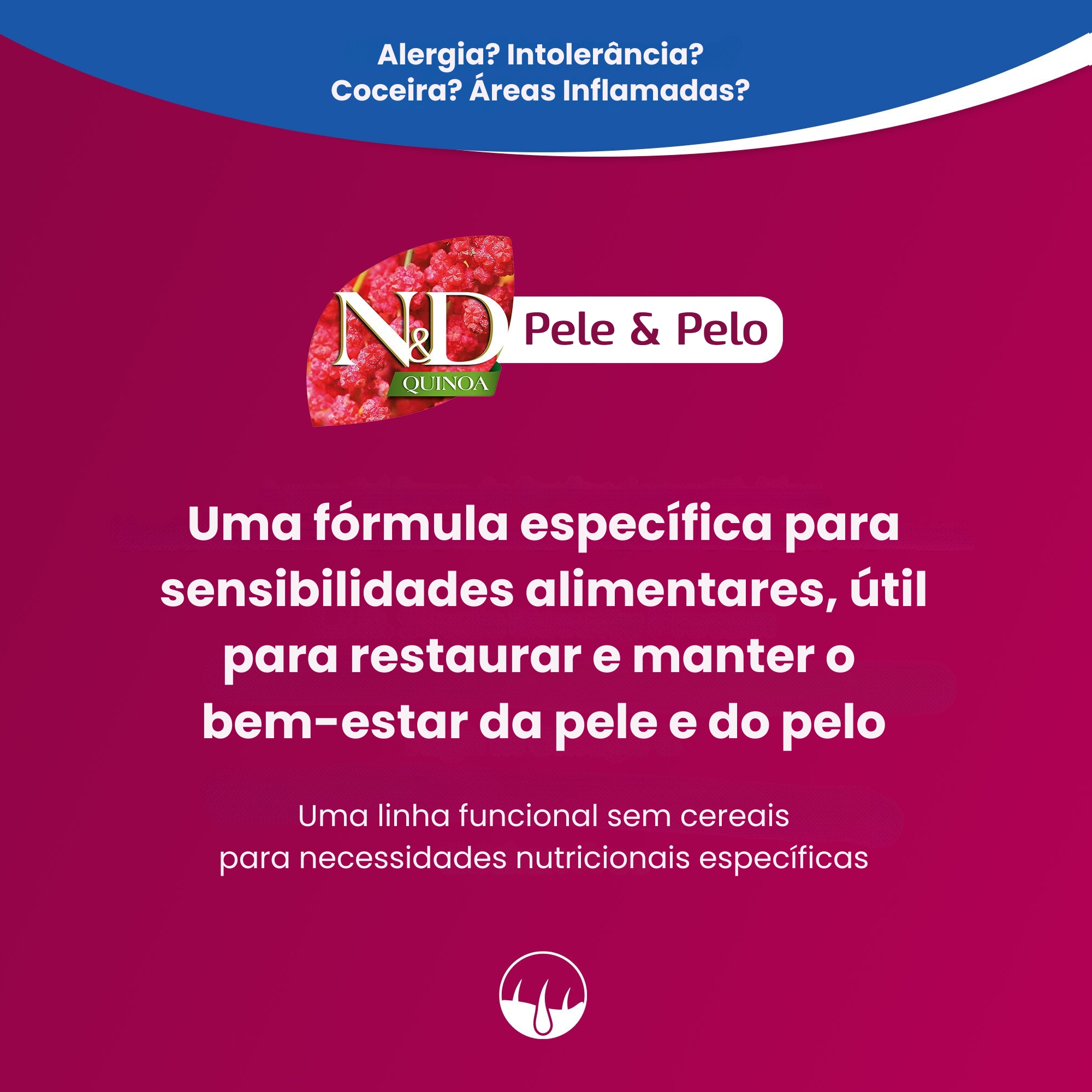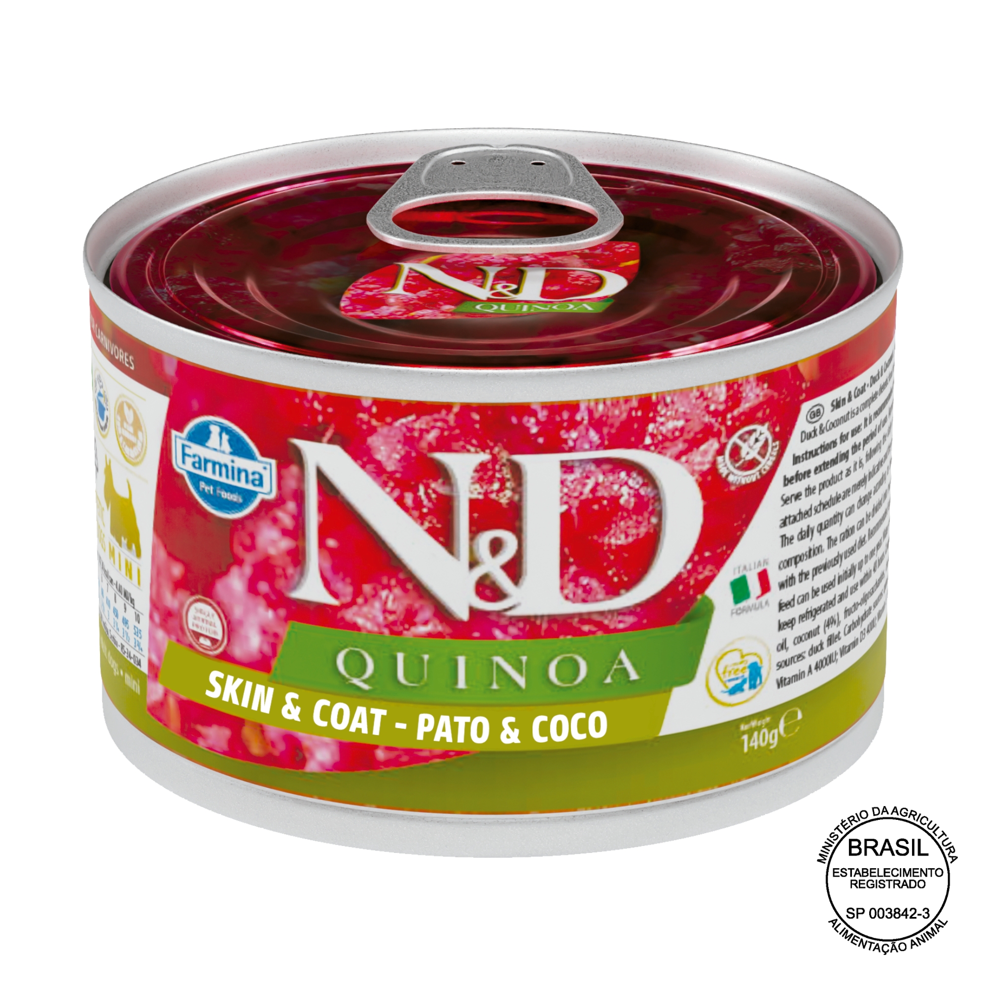 COMPOSIÇÃO BÁSICA: carne de pato (mín. 55%), grão de quinoa (mín. 5%), óleo de peixe, polpa de coco desidratada (mín. 2%), aditivo prebiótico (FOS), cloreto de colina, carbonato de cálcio, cloreto de potássio, sulfato de condroitina, hidrocloreto de glicosamina, vitaminas (A, D3, E), quelato zinco-metionina hidroxi analoga, quelato manganês-metionina hidroxi analoga, ferro aminoacido quelato, quelato cobre-metionina hidroxi analoga, levedura enriquecida com selênio, DL-metionina, taurina, L-Carnitina.