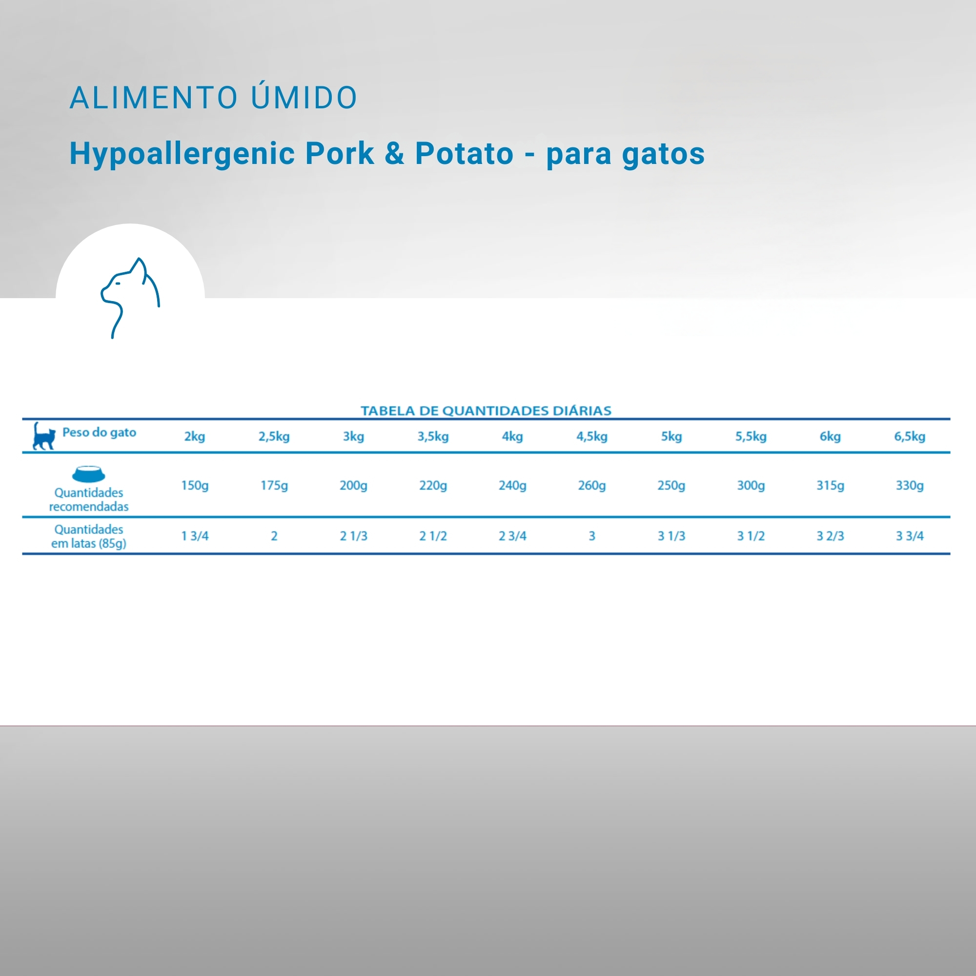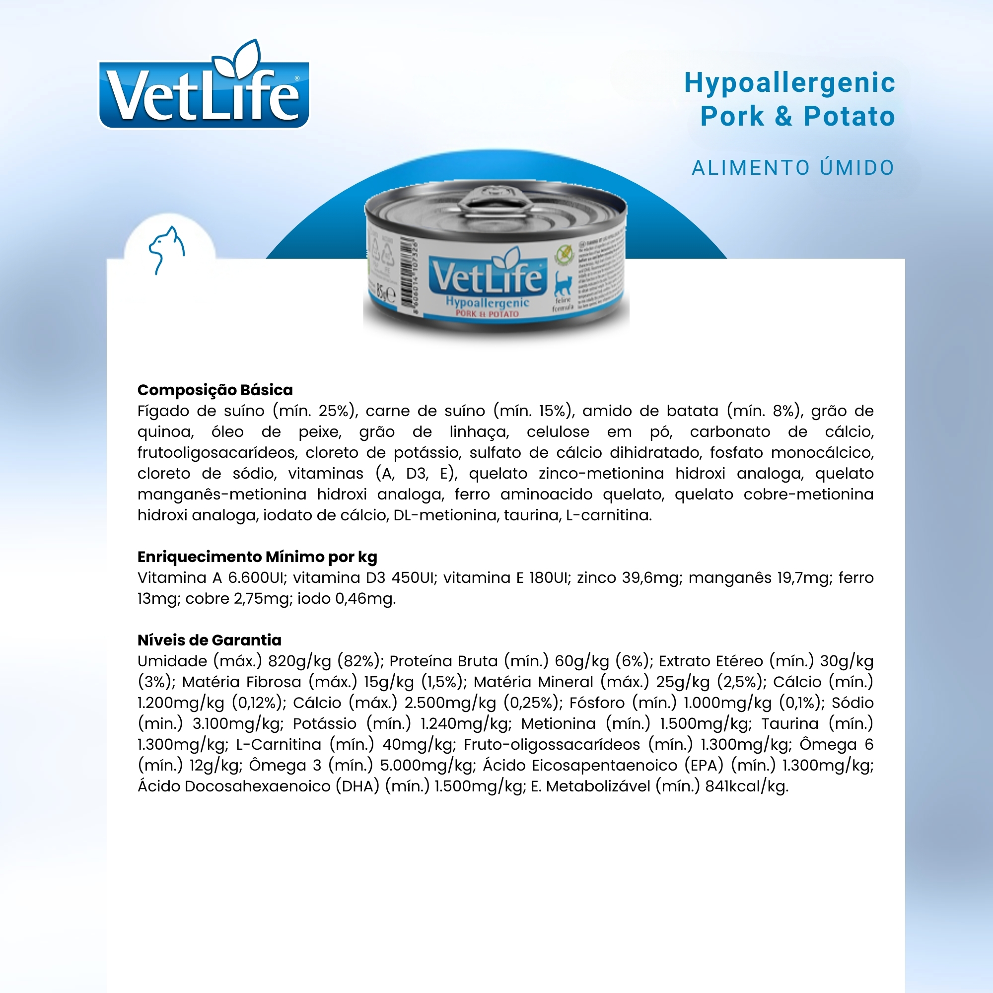 COMPOSIÇÃO BÁSICA: fígado de suíno (mín. 25%), carne de suíno (mín. 15%), amido de batata (mín. 8%), grão de quinoa, óleo de peixe, grão de linhaça, celulose em pó, carbonato de cálcio, frutooligosacarídeos, cloreto de potássio, sulfato de cálcio dihidratado, fosfato monocálcico, cloreto de sódio, vitaminas (A, D3, E), quelato zinco-metionina hidroxi analoga, quelato manganês-metionina hidroxi analoga, ferro aminoacido quelato, quelato cobre-metionina hidroxi analoga, iodato de cálcio, DL-metionina, taurina, L-carnitina.